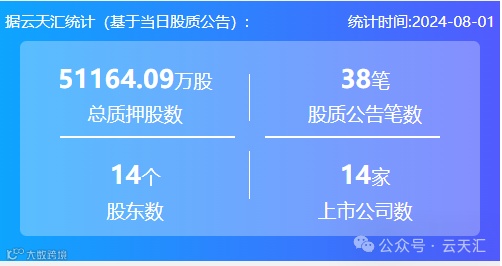 2024年8月1日,股票质押总质押股数5.12亿股,上市公司数14家,股质公告笔数38笔,股东数14个。