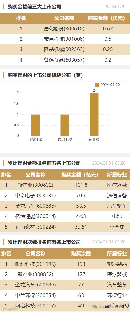 2024年05月20日,上市公司购买理财金额1.57亿元,共4家上市公司,理财产品5个,单笔最大投资期限361天。