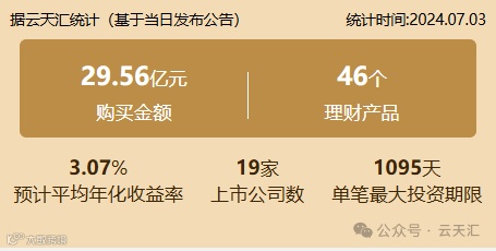 2024年07月03日,上市公司购买理财金额29.56亿元,共19家上市公司,理财产品46个。