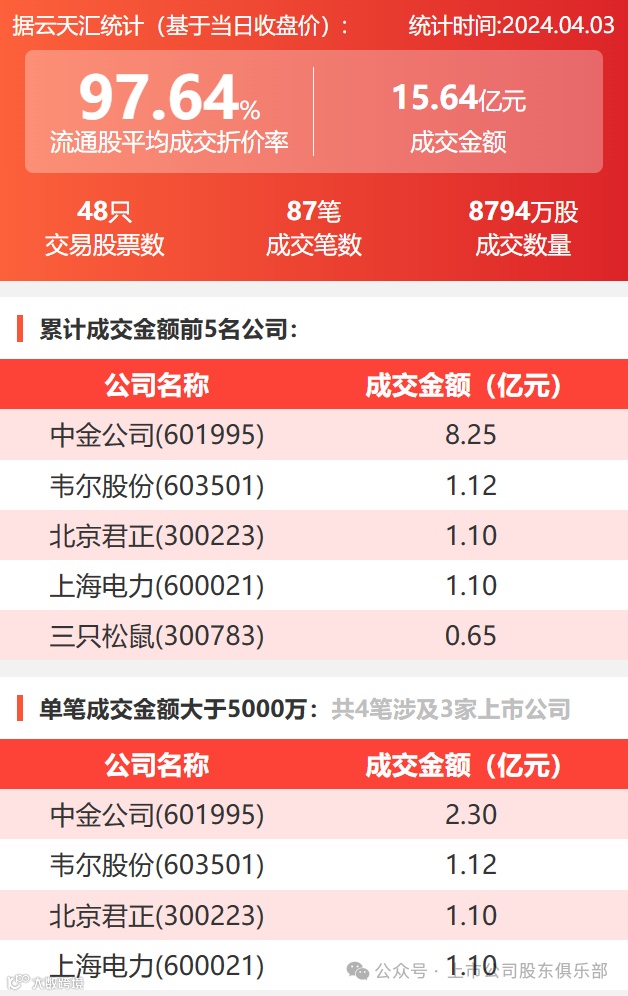 2024年4月3日,大宗交易成交金额15.64亿元,交易股票数48只,成交笔数87笔,流通股平均成交折价率97.64%,成交数量8794万股。