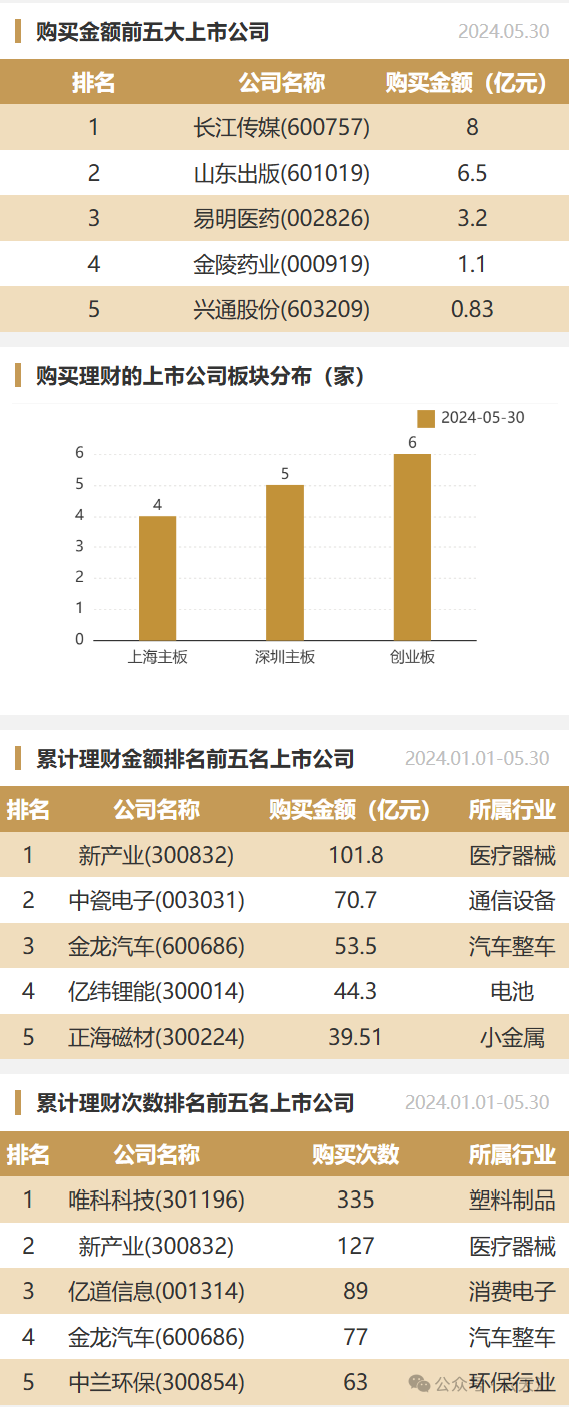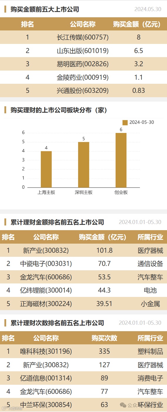 2024年05月30日,上市公司购买理财金额23.5亿元,共15家上市公司,理财产品27个,单笔最大投资期限730天。