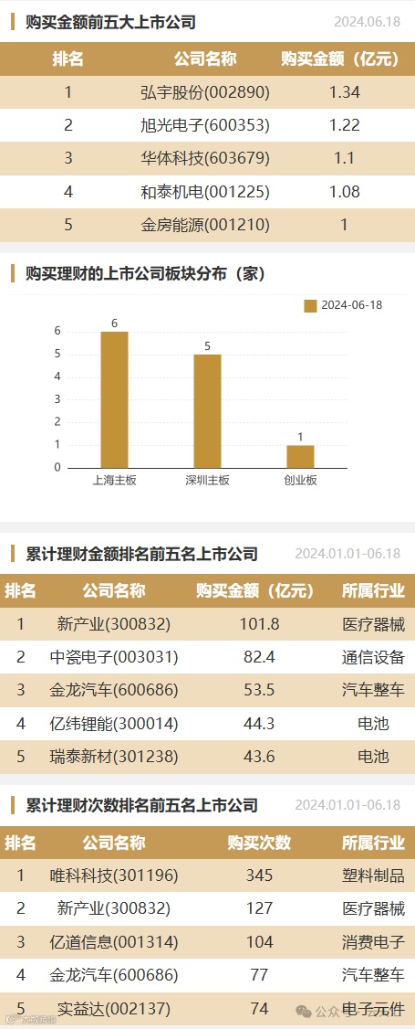 2024年06月18日,上市公司购买理财金额8.29亿元,共12家上市公司,理财产品23个,单笔最大投资期限1095天。