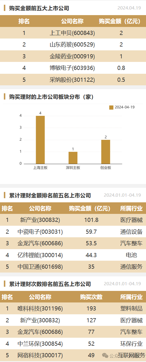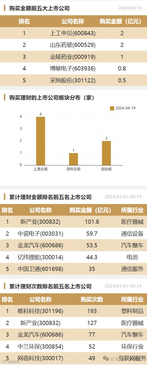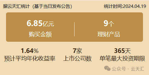2024年04月19日,上市公司购买理财金额6.85亿元,共7家上市公司,理财产品9个,单笔最大投资期限365天。
