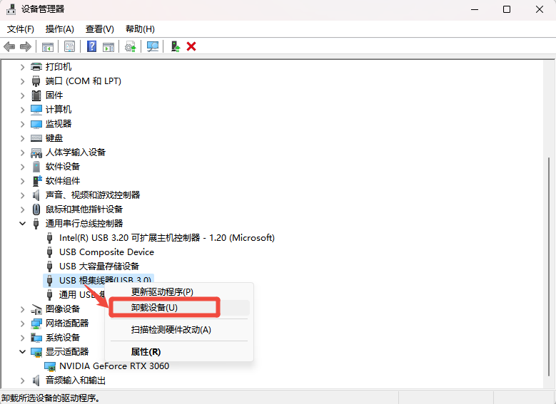 第3步:右键单击每个USB相关项目(USB根集线器等),选择“卸载设备”;