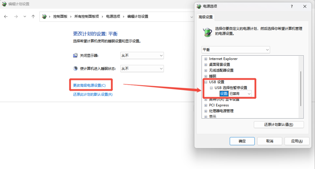 第4步:找到“USB设置” > “USB选择性暂停设置”,将其设置为“已禁用”。