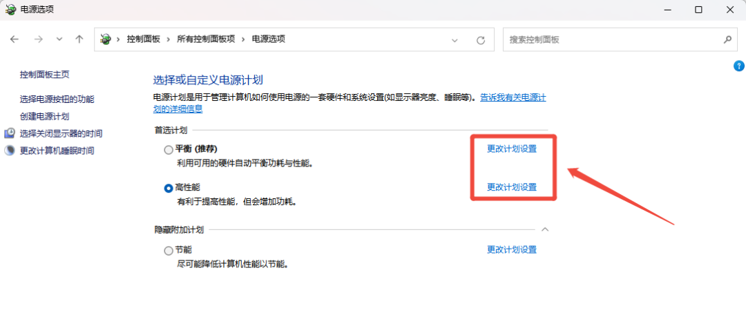 第2步:点击当前电源计划旁的“更改计划设置”;
