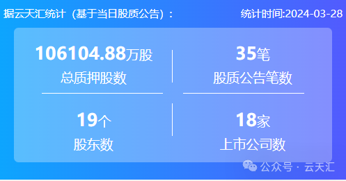 2024年3月28日,股票质押总质押股数10.61亿股,上市公司数18家,股质公告笔数35笔,股东数19个。