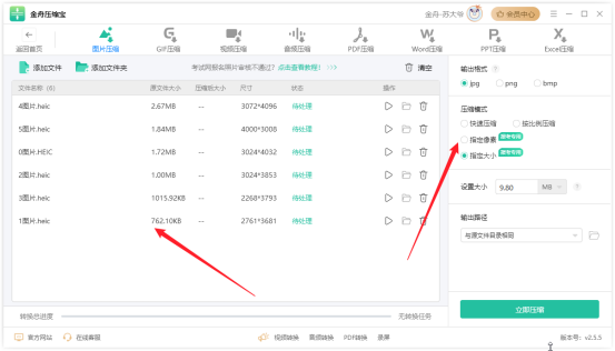 操作步骤:打开金舟压缩宝,选择“图片压缩”功能,批量导入需要压缩的图片,选择JPG格式,调整图像品质(设置压缩模式和压缩程度)进行压缩,点击“立即压缩”。