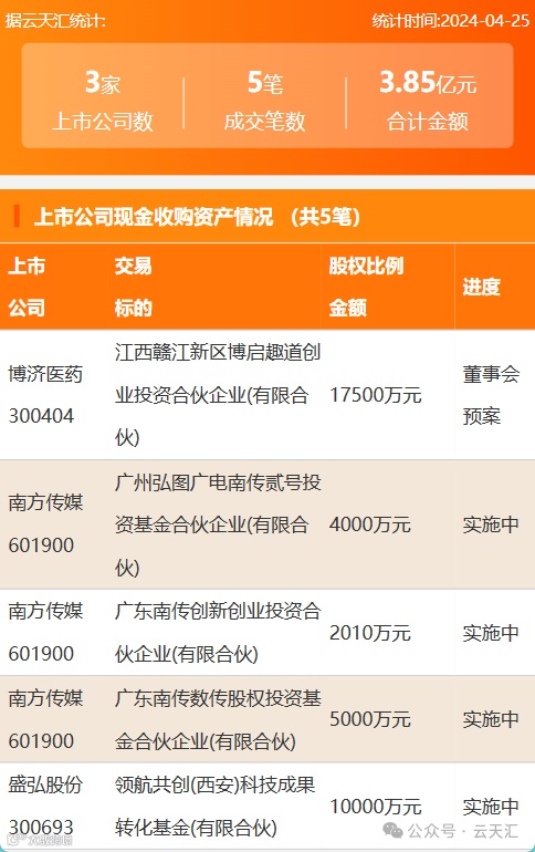 2024年4月25日,资产交易成交金额3.85亿元,上市公司3家,成交5笔,上市公司现金收购资产5笔。