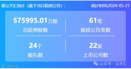 2024年5月21日,股票质押总质押股数57.60亿股,上市公司数22家,股质公告笔数61笔,股东数24个。