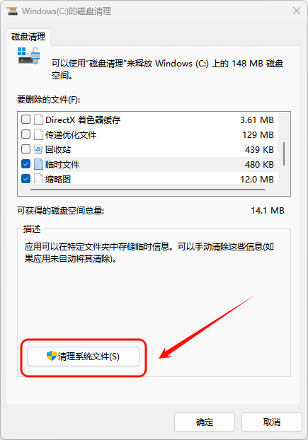 Step3:勾选“临时文件”、“Windows更新清理”等→点击“清理系统文件”→勾选“以前的Windows安装”→确定。