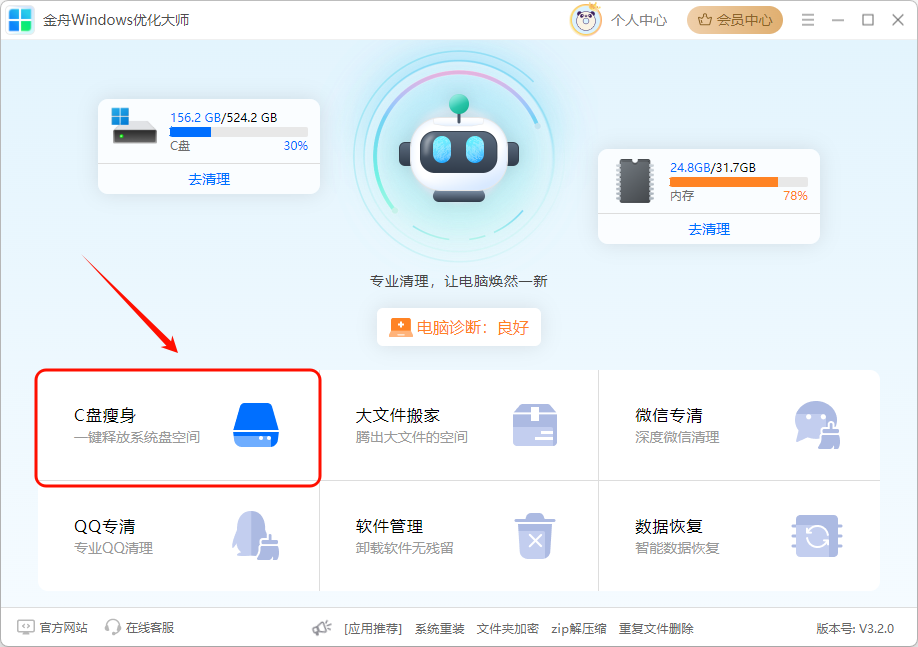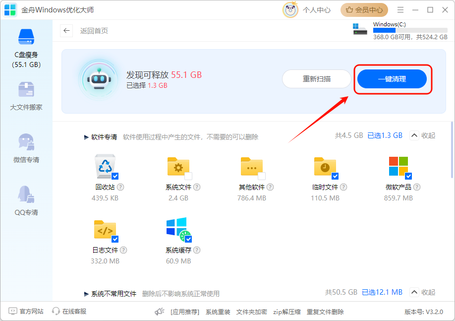 金舟Windows优化大师是一款功能强大的系统优化工具,能帮你轻松清理C盘。