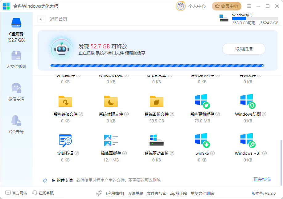 Step1:打开金舟Windows优化大师,选择“C盘瘦身”功能,开始扫描。