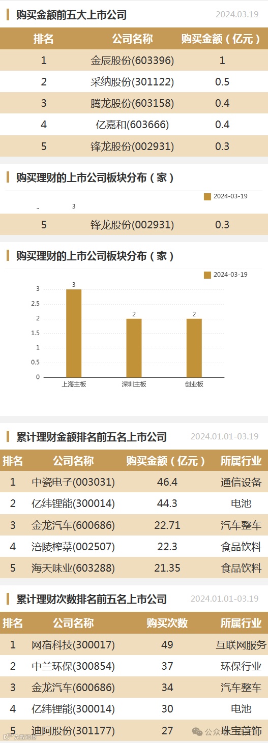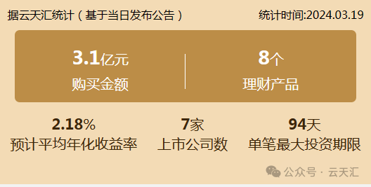 2024年03月19日,上市公司购买理财金额3.1亿元,共7家上市公司,理财产品8个,单笔最大投资期限94天。