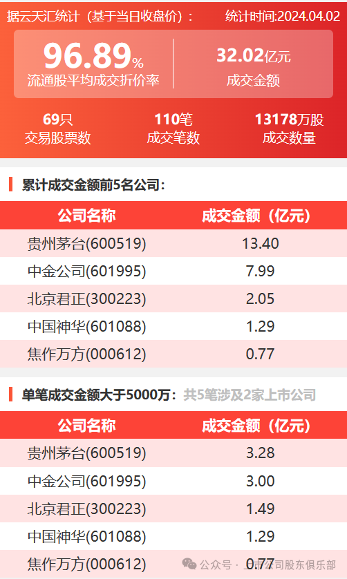2024年4月2日,大宗交易成交金额32.02亿元,交易股票数69只,成交笔数110笔,流通股平均成交折价率96.89%,成交数量1.32亿股。