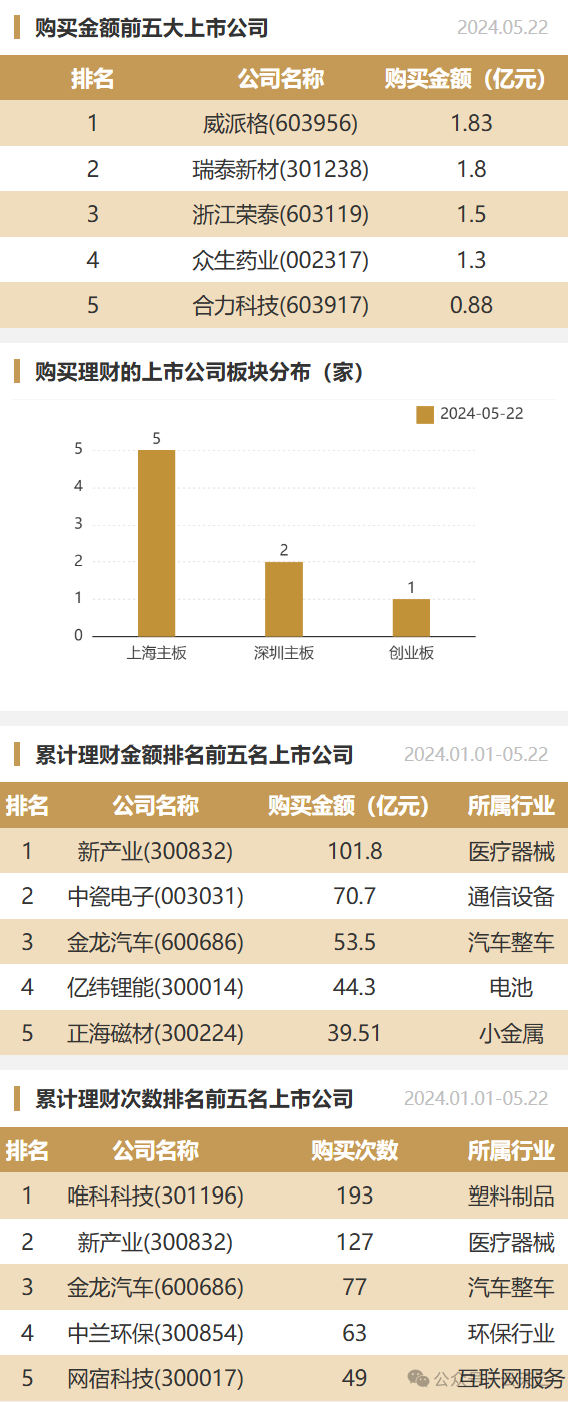 2024年05月22日,上市公司购买理财金额7.91亿元,共8家上市公司,理财产品9个,单笔最大投资期限365天。
