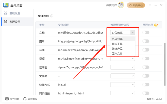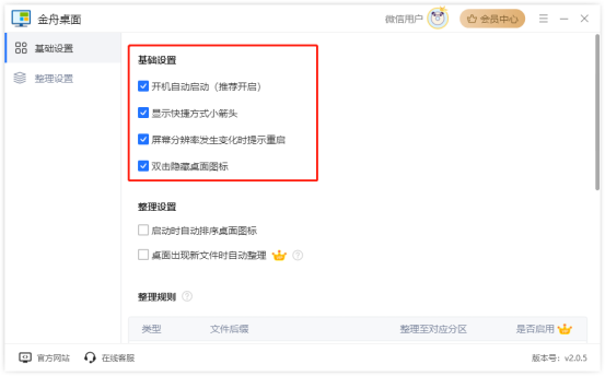 Step1:电脑运行金舟桌面,在首页中选择「整理设置」;在这里,我们可以根据文件类型设置规则;