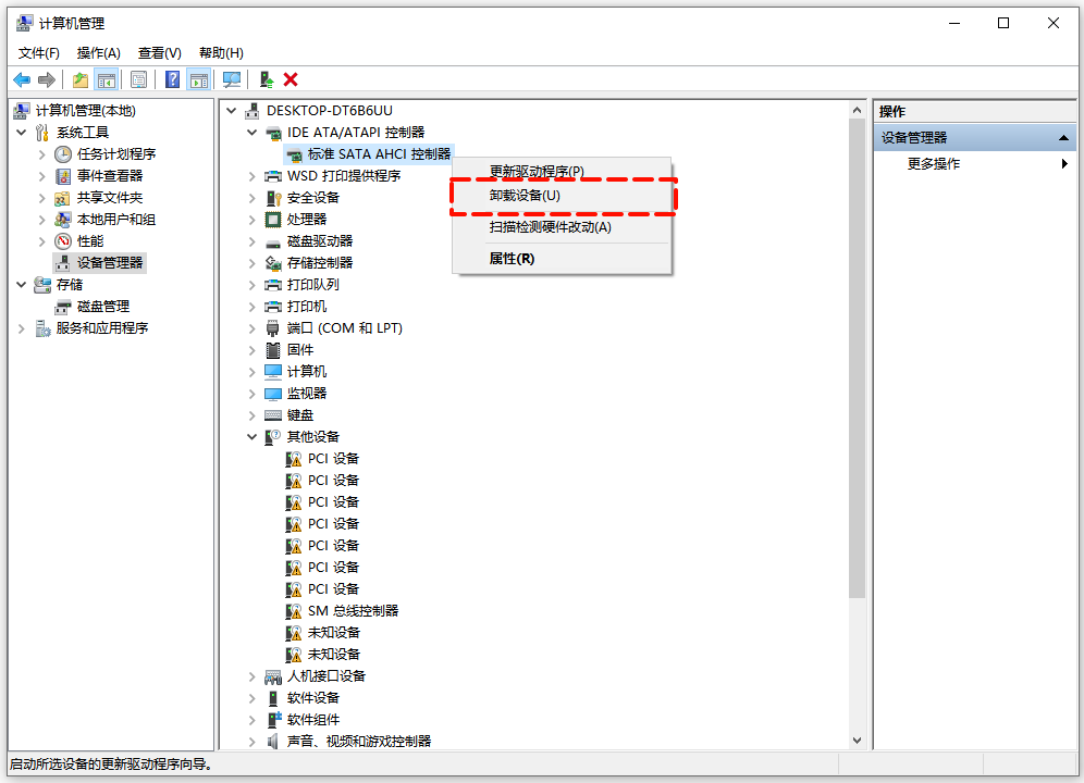 ① 进入设备管理器,右键点击“IDEATA/ATAPI控制器”或“SCSI控制器”,选择“卸载设备”,勾选“删除驱动程序软件”。