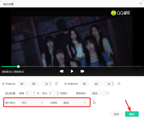 按钮,在弹出设置窗口,可以选取某个瞬间定格,输入开始时间和结束时间,选择输出数量和画面填充设置。