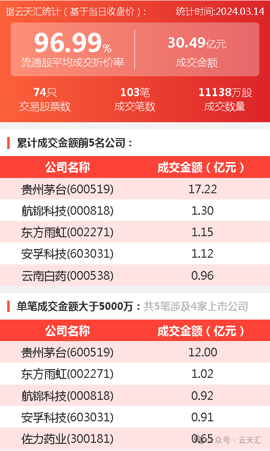 2024年3月14日,大宗交易成交金额30.49亿元,交易股票数74只,成交笔数103笔,流通股平均成交折价率96.99%,成交数量1.11亿股。