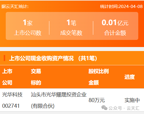 2024年4月8日,资产交易成交金额0.01亿元,上市公司1家,成交1笔,上市公司现金收购资产1笔。