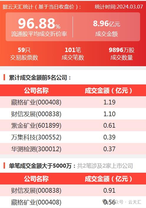 2024年3月7日,大宗交易成交金额8.96亿元,交易股票数59只,成交笔数101笔,流通股平均成交折价率96.88%,成交数量9896万股。