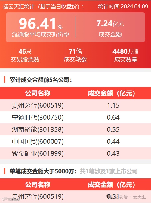 2024年4月9日,大宗交易成交金额7.24亿元,交易股票数46只,成交笔数71笔,流通股平均成交折价率96.41%,成交数量4480万股。