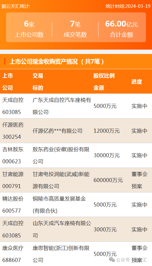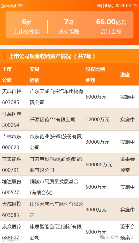 2024年3月19日,资产交易成交金额66亿元,上市公司6家,成交7笔,上市公司现金收购资产7笔。