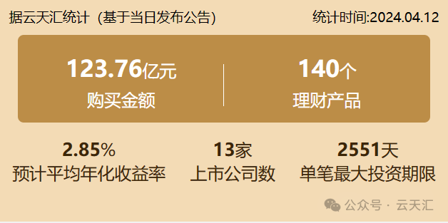 2024年04月12日,上市公司购买理财金额123.76亿元,共13家上市公司,理财产品140个,单笔最大投资期限2551天。