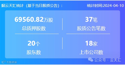 2024年4月10日,股票质押总质押股数6.96亿股,上市公司数18家,股质公告笔数37笔,股东数20个。