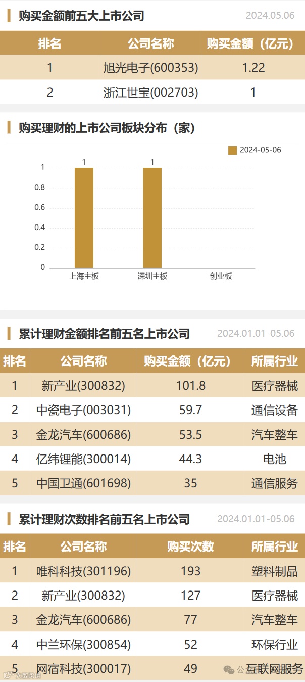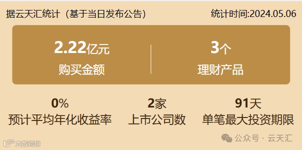 2024年05月06日,上市公司购买理财金额2.22亿元,共2家上市公司,理财产品3个,单笔最大投资期限91天。