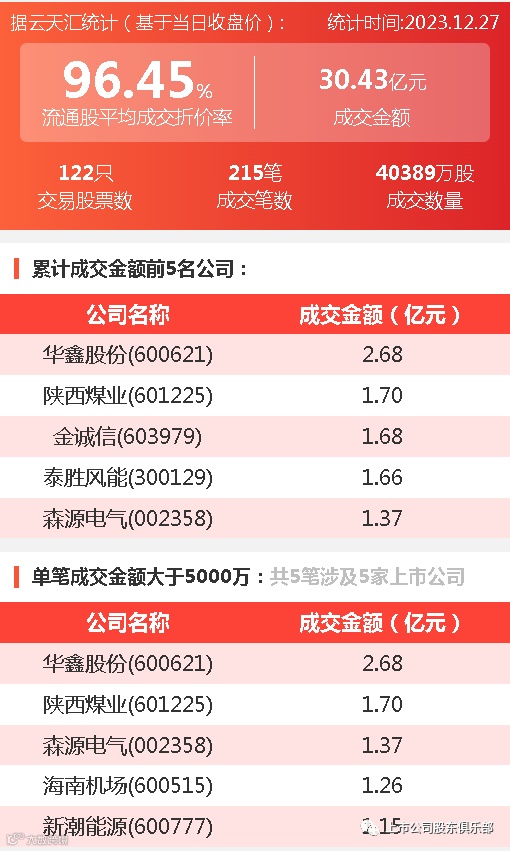 2023年12月27日,大宗交易成交金额30.43亿元,交易股票数122只,成交笔数215笔,流通股平均成交折价率96.45%,成交数量40389万股。