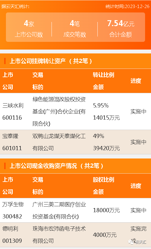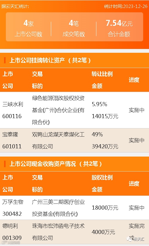 2023年12月26日,资产交易成交金额7.54亿元,上市公司4家,成交4笔,上市公司现金收购资产4笔。