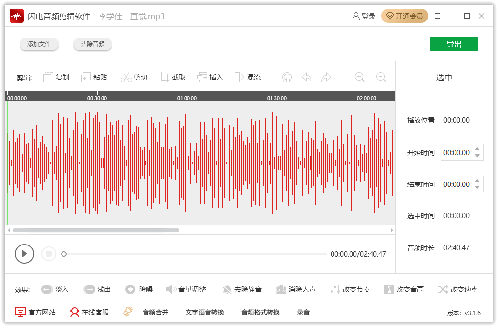 这是一款专业高效的音频剪辑软件,提供剪切、合并、混流、降噪等等多种编辑功能,支持多种音频格式的导入导出,简单易操作。最主要的特点即是简单、易上手。