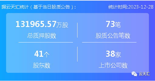 2023年12月28日,股票质押总质押股数13.20亿股,上市公司数38家,股质公告笔数73笔,股东数41个。