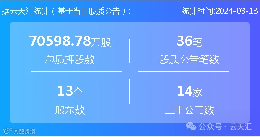 2024年3月13日,股票质押总质押股数7.06亿股,上市公司数14家,股质公告笔数36笔,股东数13个。