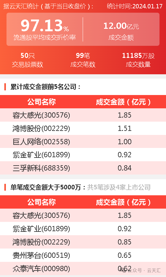 2024年1月17日,大宗交易成交金额12亿元,交易股票数50只,成交笔数99笔,流通股平均成交折价率97.13%,成交数量1.12亿股。
