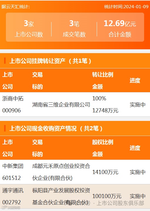 2024年1月9日,资产交易成交金额12.69亿元,上市公司3家,成交3笔,上市公司挂牌转让资产1笔,现金收购资产2笔。