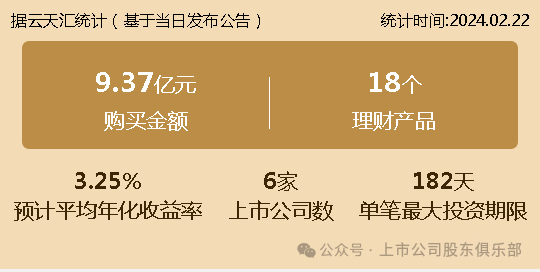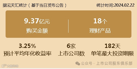 2024年02月22日,上市公司购买理财金额9.37亿元,共6家上市公司,理财产品18个,单笔最大投资期限182天。
