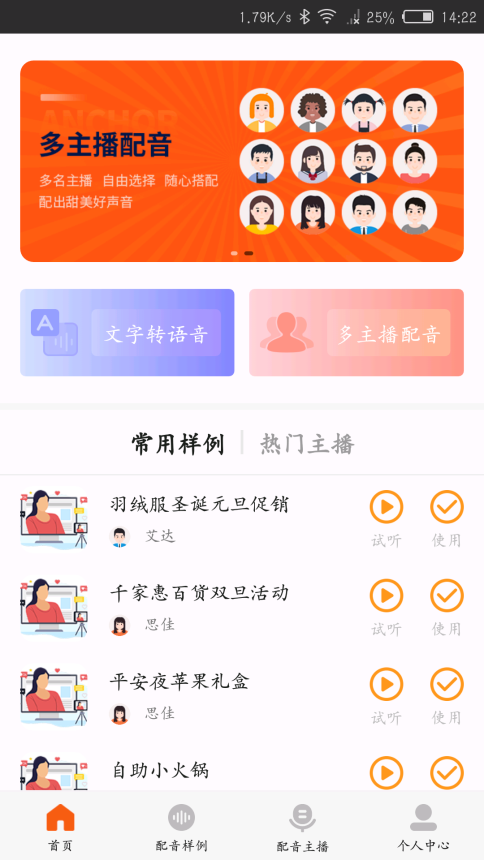 打开软件后可以看到,软件共分为两种配音模式,一种是文字转语音,另一种是多主播配音