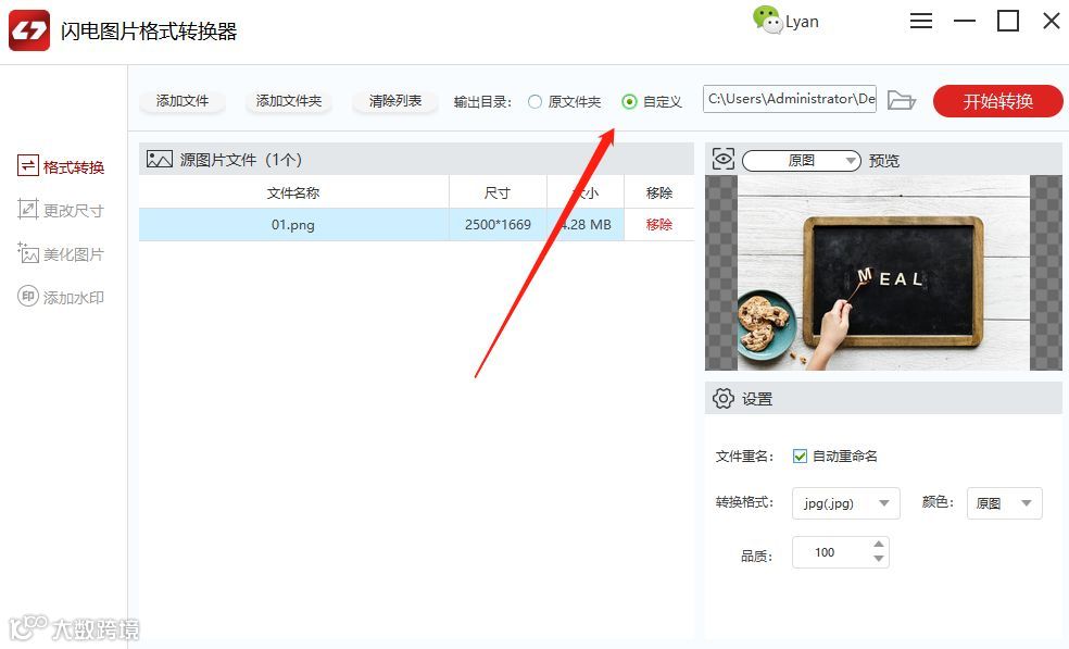 第四步、软件默认的文件保存位置是原文件夹,如需更换,勾选中“输出目录”中的“自定义”按钮后再选择一个新的保存位置即可。