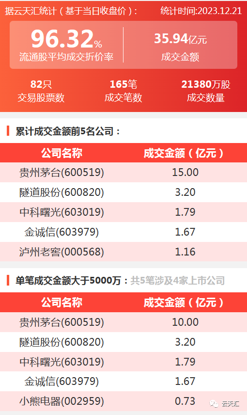 2023年12月21日,大宗交易成交金额35.94亿元,交易股票数82只,成交笔数165笔,流通股平均成交折价率96.32%,成交数量21380万股。