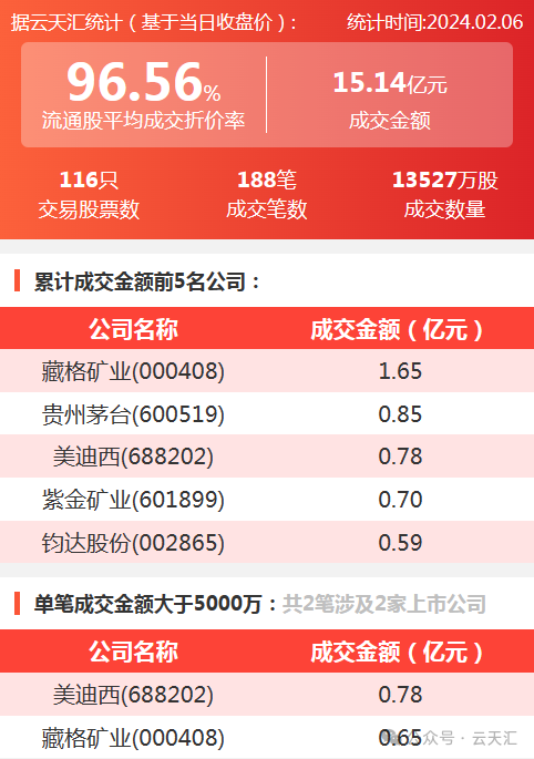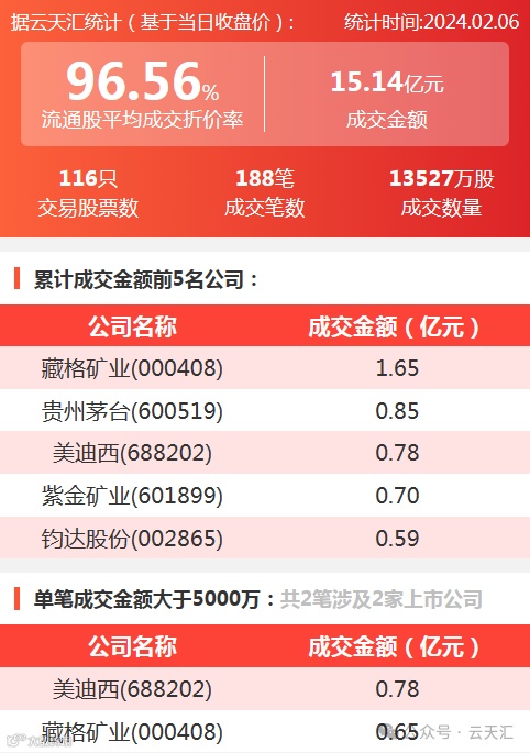 2024年2月6日,大宗交易成交金额15.14亿元,交易股票数116只,成交笔数188笔,流通股平均成交折价率96.56%,成交数量1.35亿股。