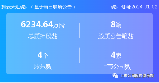 2024年01月02日,股票质押总质押股数6234.64万股,上市公司数4家,股质公告笔数8笔,股东数4个。