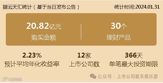2024年01月31日,上市公司购买理财金额20.82亿元,共12家上市公司,理财产品30个,单笔最大投资期限366天。