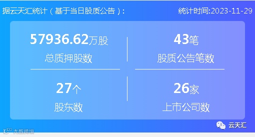 2023年11月29日,股票质押总质押股数5.79亿股,上市公司数26家,股质公告笔数43笔,股东数27个。