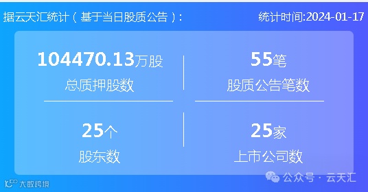 2024年1月17日,股票质押总质押股数10.45亿股,上市公司数25家,股质公告笔数55笔,股东数25个。
