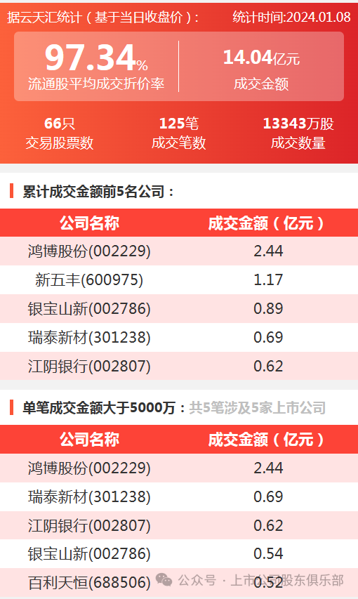 2024年1月8日,大宗交易成交金额14.04亿元,交易股票数66只,成交笔数125笔,流通股平均成交折价率97.34%,成交数量13343万股。