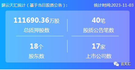 2023年11月3日,股票质押总质押股数11.17亿股,上市公司数17家,股质公告笔数40笔,股东数18个。
