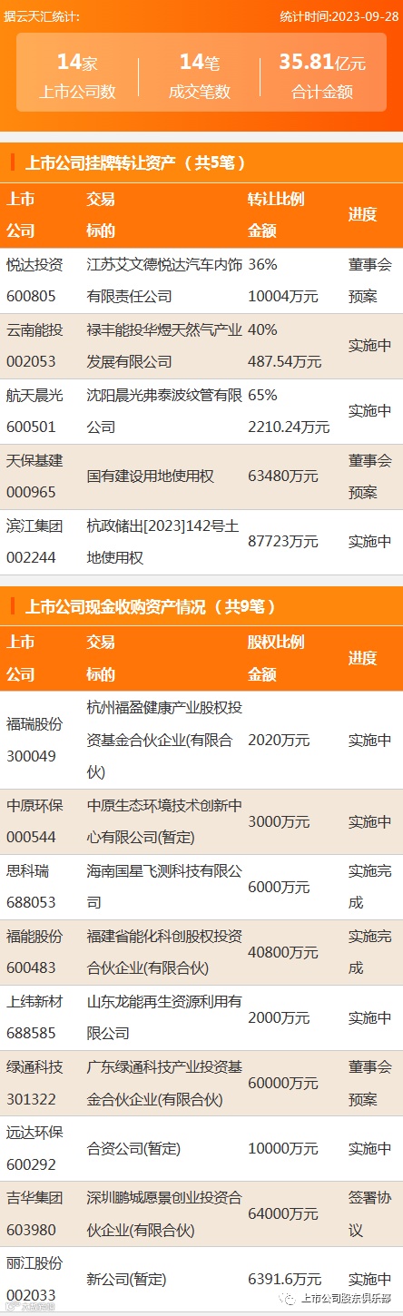 2023年9月28日,资产交易成交金额35.81亿元,上市公司14家,成交14笔,上市公司挂牌转让资产5笔,现金收购资产9笔。